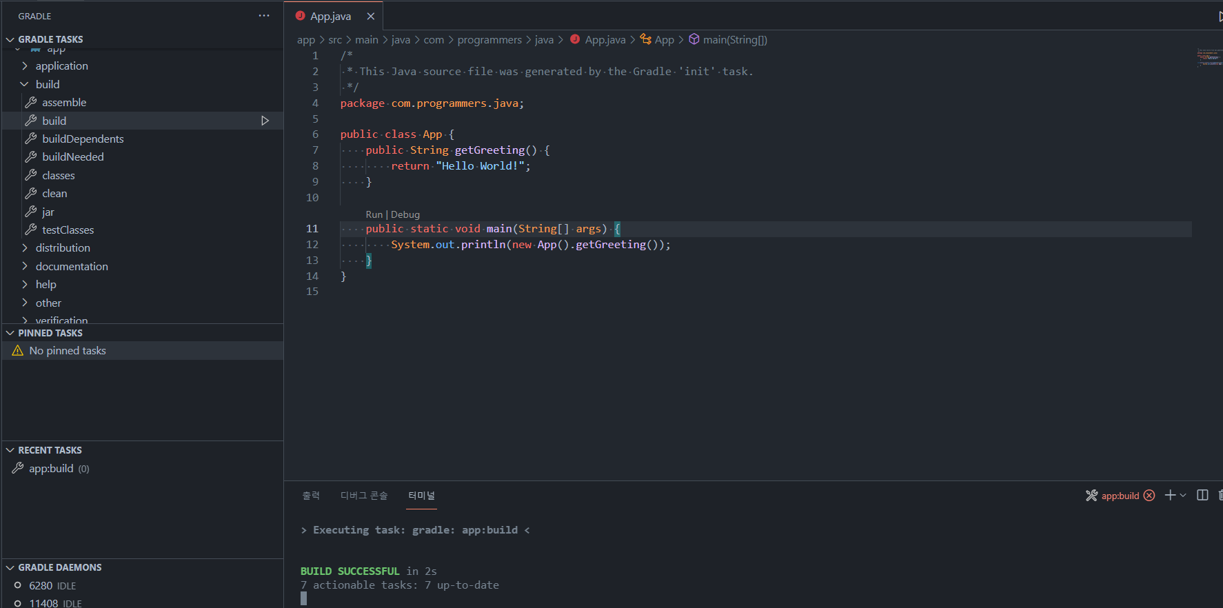 vscode를 사용하면 조금 더 편하게 gradle명령어 목록을 확인하고 실행할 수 있다.