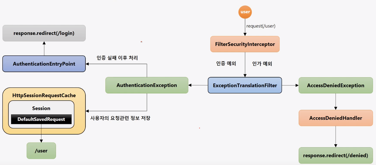 FilterSecurityInterceptor와 밀접한 관계가 있는데, 그 이유는 ExceptionTranslationFilter가 try-catch 블록으로 감싼뒤 SecurityInterceptor를 실행하는 구조이고, 이 과정에서 발생하는 에러를 처리하는 필터이기 때문이다.