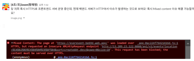 ํ๋ก ํธ์๋ ์๋ฒ์์ https๋ก ๋ฐฐํฌํ๊ธฐ ๋๋ฌธ์ http๋ก ๋ฐฐํฌ๋ ๋ฐฑ์๋ api ํธ์ถ ์ Mixed content ์๋ฌ๊ฐ ๋ฐ์ํ๊ณ , ํด๊ฒฐํ๊ธฐ ์ํด์๋ https๋ก ๋ฐฑ์๋ ์๋ฒ๋ฅผ ๋ฐฐํฌํ๋ ๋ฐฉ๋ฒ์ด ์์์ต๋๋ค. Mixed content๋?