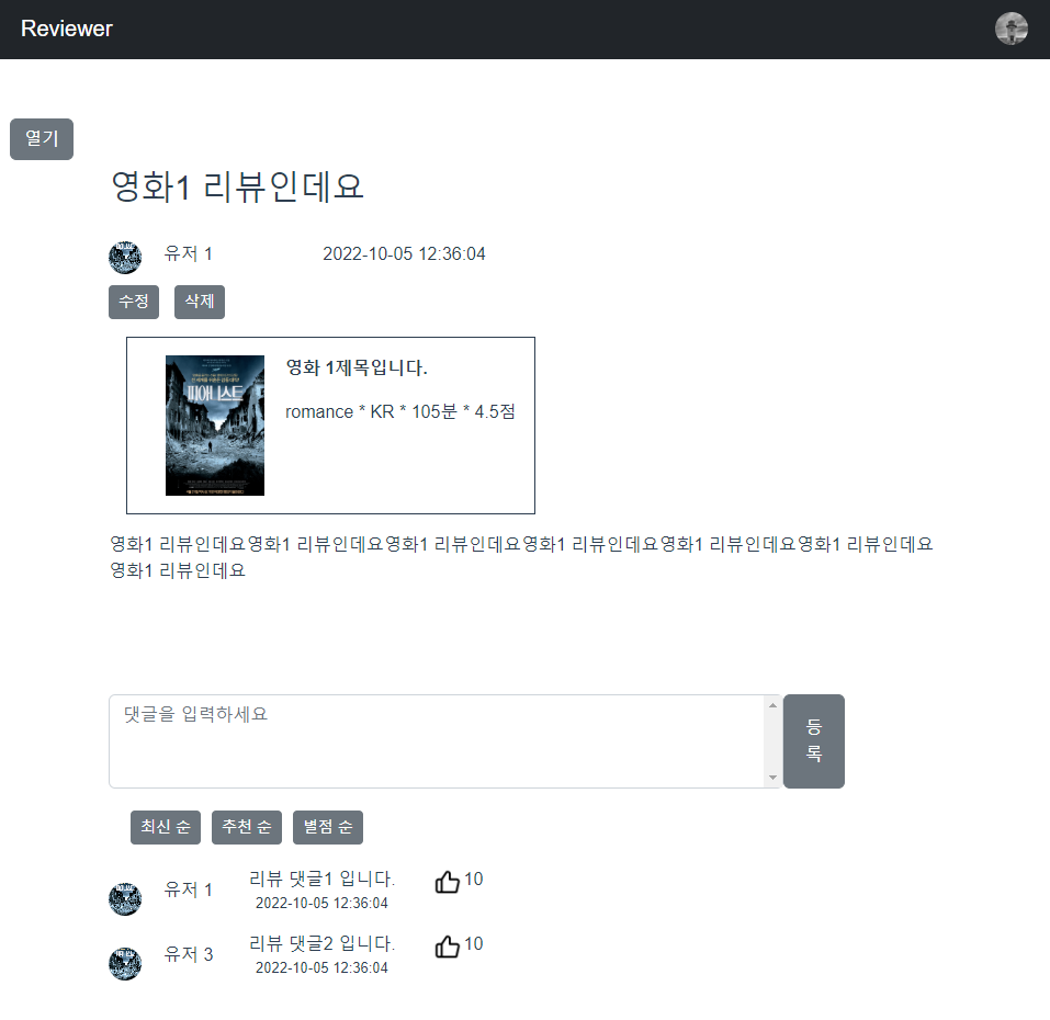 댓글 조회가 가능하고, 각 유저와 영화정보를 클릭할 시 상세정보로 이동한다.