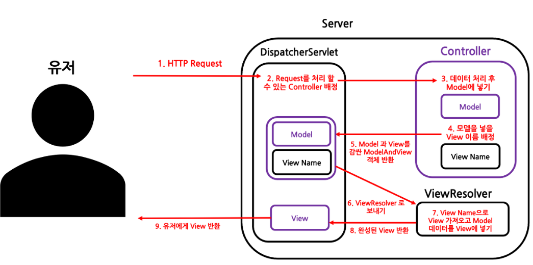 ViewResolver에서는 ModelAndView 객체를 처리해 View를 그린다. 여기서는 모델에 저장된 데이터를 사용해 View를 그려준다. View는 사용자에게 보여줄 완성된 View이며, 여기서 그려지는 View는 그대로 유저에게 반환된다. 우리가 특정한 url로 들어갔을 때 우리에게 보여지는 View가 바로 이곳에서 만들어지는 View이다.