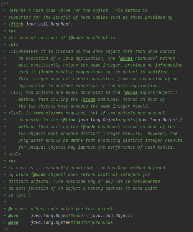 hashCode 메서드의 주석을 읽어보면 아래의 내용이 적혀있다.