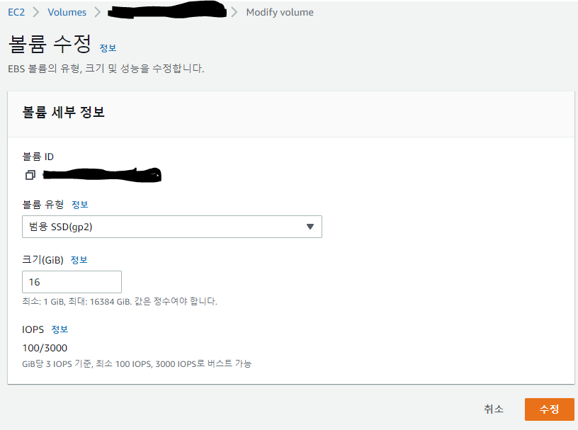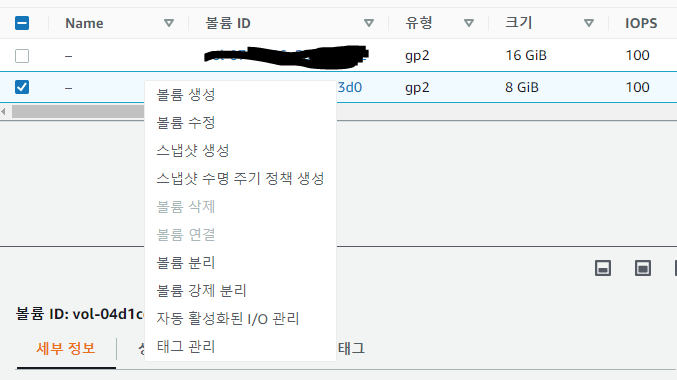 1. EC2 ๋์๋ณด๋ - EBS - ๋ณผ๋ฅจํญ์์ ๋ณผ๋ฅจ ์์
