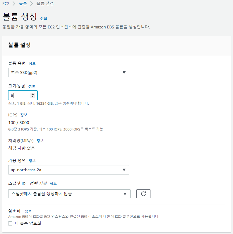 1. EC2 ๋์๋ณด๋ - EBS - ๋ณผ๋ฅจํญ์์ ๋ณผ๋ฅจ ์์ฑ